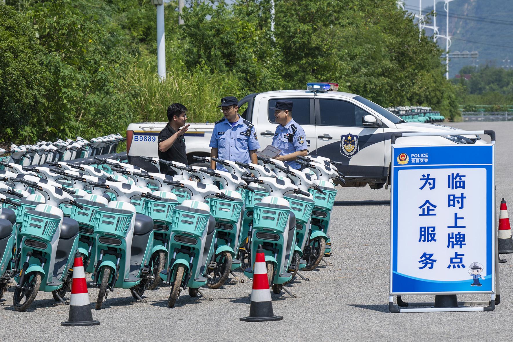 9月5日,安徽省蕪湖市公安局繁昌分局交通管理大隊(duì)車(chē)輛管理所民警在繁陽(yáng)鎮(zhèn)為一家共享電動(dòng)自行車(chē)企業(yè)提供上門(mén)上牌服務(wù)。