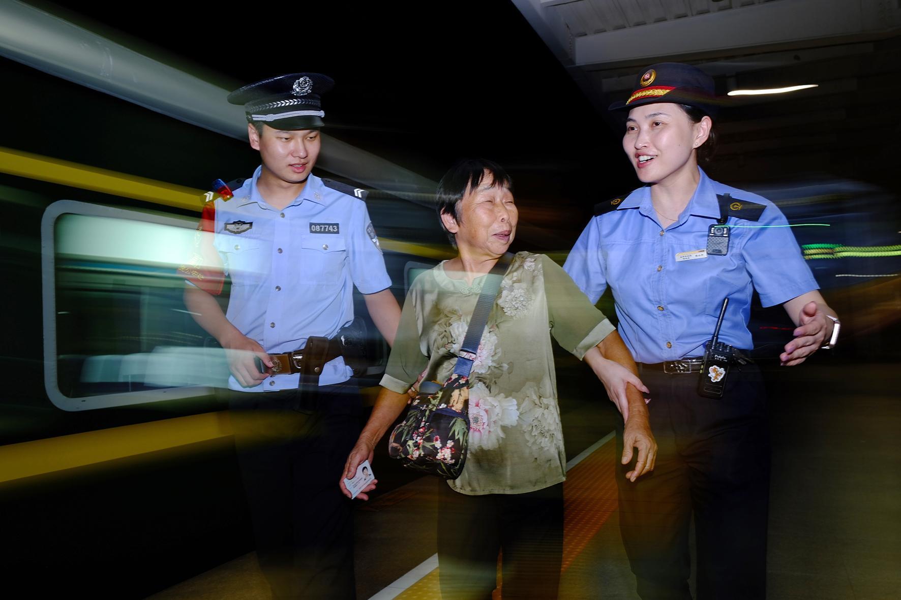 10月15日晚,杭州鐵路公安處金華站派出所民警與車站員工熱情幫助一位78歲、首次乘火車出行的大媽上車。