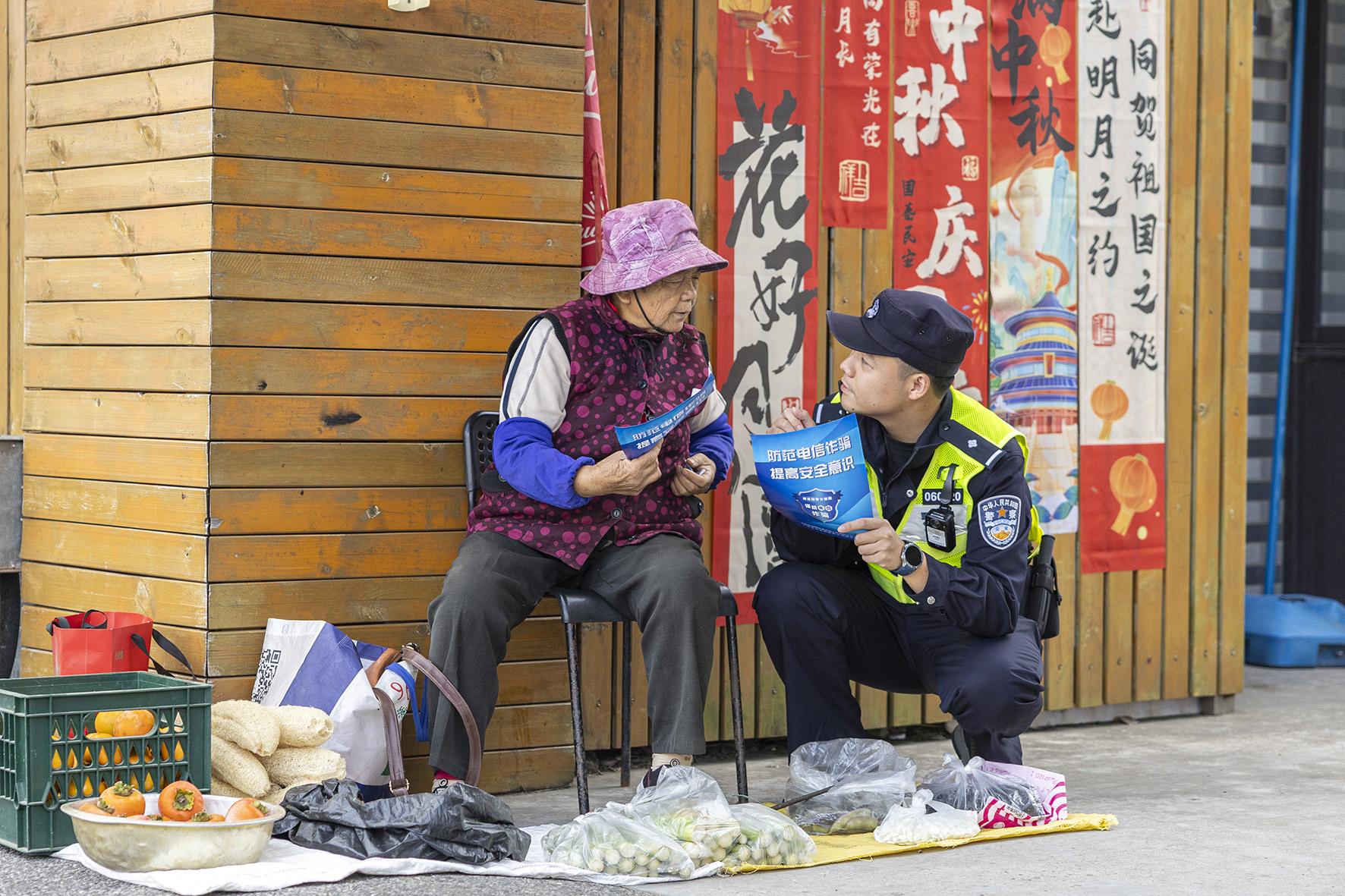 10月23日,上海市公安局崇明分局建設(shè)派出所民警來(lái)到轄區(qū)鄉(xiāng)間集市,向擺攤的商戶(hù)宣傳防范電信網(wǎng)絡(luò)詐騙知識(shí)。