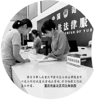 圖為當(dāng)事人在重慶市渝北區(qū)公共法律服務(wù)中心設(shè)立的行政復(fù)議咨詢點(diǎn)咨詢,并當(dāng)場(chǎng)提交行政復(fù)議申請(qǐng)。