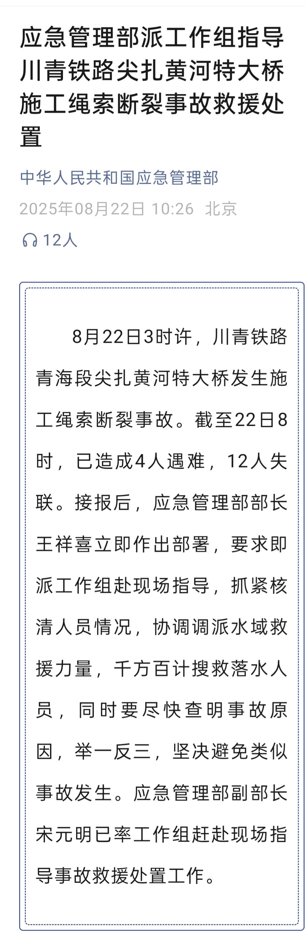 8月22日,應急管理部發(fā)布消息,8月22日3時許,川青鐵路青海段尖扎黃河特大橋發(fā)生施工繩索斷裂事故。截至22日8時,已造成4人遇難,12人失聯(lián)。接報后,應急管理部部長王祥喜立即作出部署,要求即派工作組赴現場指導,抓緊核清人員情況,協(xié)調調派水域救援力量,千方百計搜救落水人員,同時要盡快查明事故原因,舉一反三,堅決避免類似事故發(fā)生。應急管理部副部長宋元明已率工作組趕赴現場指導事故救援處置工作。