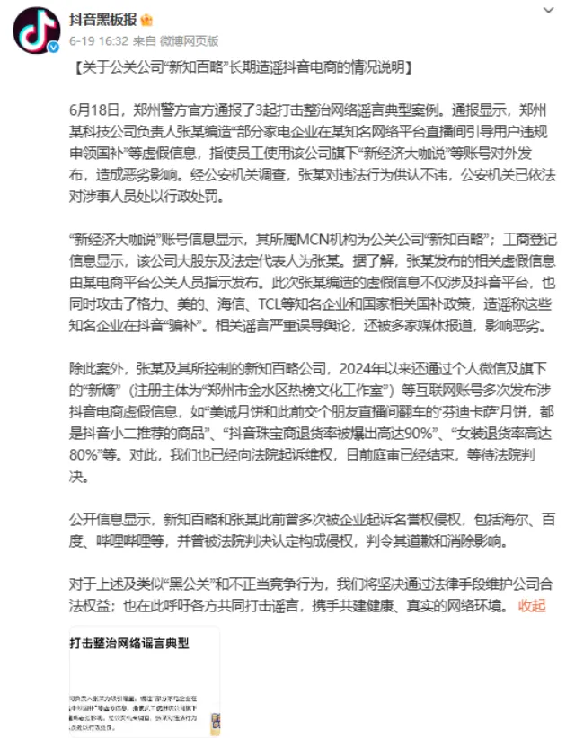次日,抖音黑板報發(fā)布情況說明,指出警方通報中的公關(guān)公司為新知百略,其負責人張某此次編造的虛假信息涉及抖音,同時攻擊了格力、美的、海信、TCL等知名企業(yè)和國家相關(guān)國補政策,造謠稱這些知名企業(yè)在抖音“騙補”。相關(guān)謠言嚴重誤導輿論,還被多家媒體報道,影響惡劣。