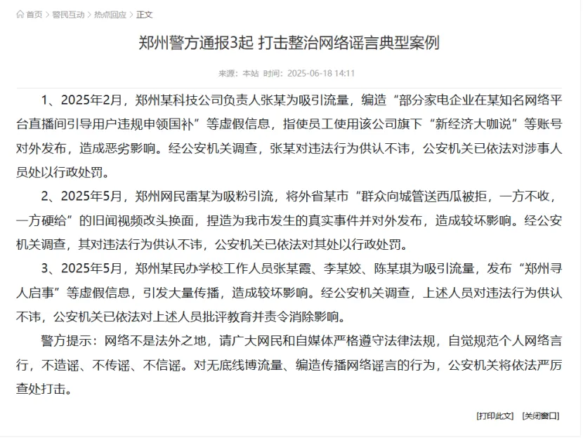 2025年2月,鄭州某科技公司負責人張某為吸引流量,編造“部分家電企業(yè)在某知名網(wǎng)絡平臺直播間引導用戶違規(guī)申領(lǐng)國補”等虛假信息,指使員工使用該公司旗下“新經(jīng)濟大咖說”等賬號對外發(fā)布,造成惡劣影響。經(jīng)公安機關(guān)調(diào)查,張某對違法行為供認不諱,公安機關(guān)已依法對涉事人員處以行政處罰,“618”當天,鄭州警方對此進行了公開通報。