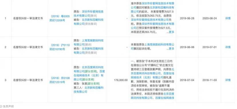 公開信息顯示,新知百略和張某此前曾多次被企業(yè)起訴名譽權(quán)侵權(quán),包括海爾、百度等,并曾被法院判決認定構(gòu)成侵權(quán),判令其道歉和消除影響。
