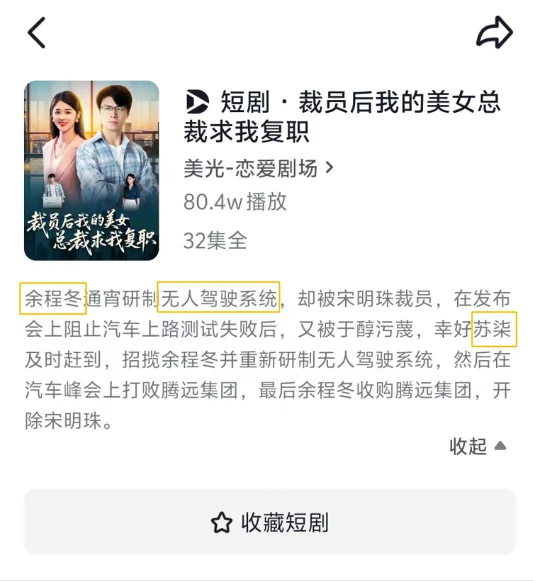 例如,余程冬名字與華為高管余承東高度相似、驍米集團名稱似小米集團、蘇柒角色名音同小米SU7車型。短劇中還涉及無人駕駛車輛一旦上路行駛30秒,系統(tǒng)就會失控崩潰的情節(jié),引發(fā)公眾聯(lián)想。目前,兩部短劇累積播放量分別為80.4萬次、1.7億次。
