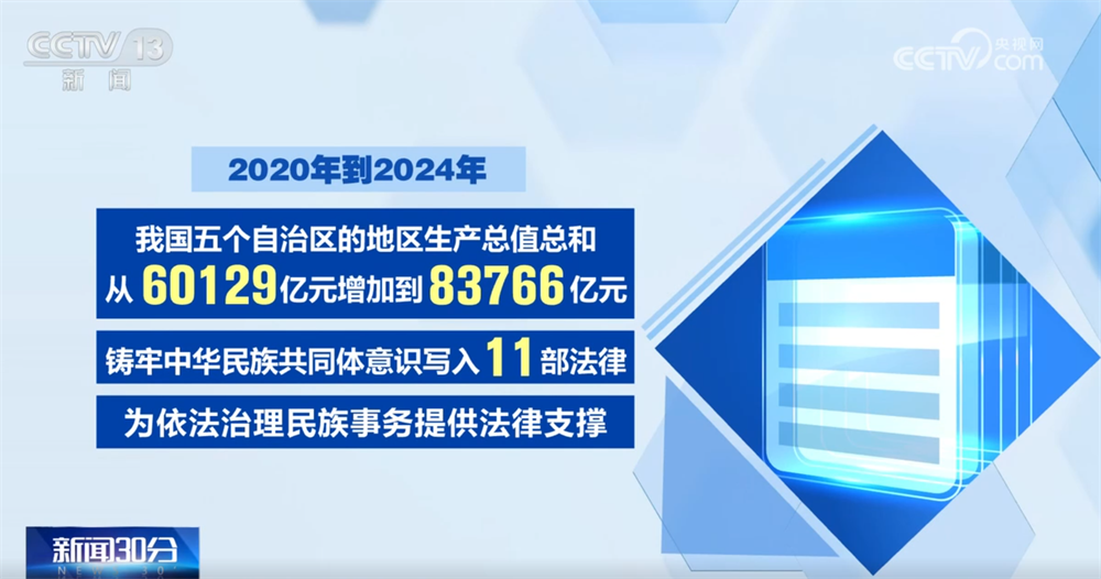 相關負責人表示,2020年到2024年,我國五個自治區(qū)的地區(qū)生產(chǎn)總值總和從60129億元增加到83766億元。鑄牢中華民族共同體意識寫入11部法律,為依法治理民族事務提供法律支撐。