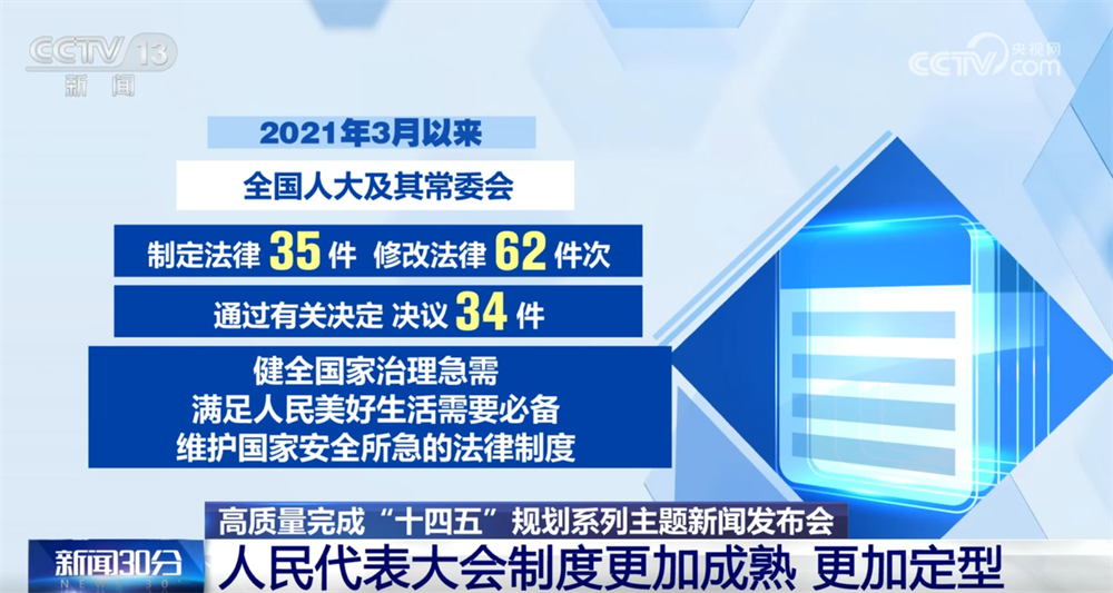 2021年3月以來,全國人大及其常委會制定法律35件、修改法律62件次,通過有關決定、決議34件,健全國家治理急需、滿足人民美好生活需要必備、維護國家安全所急的法律制度。
