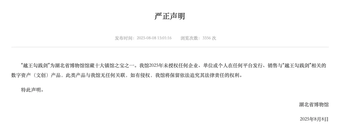 8月8日下午,湖北省博物館發(fā)布嚴(yán)正聲明稱:“越王勾踐劍”為湖北省博物館館藏十大鎮(zhèn)館之寶之一。我館2025年未授權(quán)任何企業(yè)、單位或個人在任何平臺發(fā)行、銷售與“越王勾踐劍”相關(guān)的數(shù)字資產(chǎn)(文創(chuàng))產(chǎn)品,此類產(chǎn)品與我館無任何關(guān)聯(lián),如有侵權(quán),我館將保留依法追究其法律責(zé)任的權(quán)利。