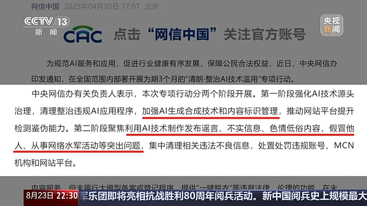 說到規(guī)則,關于AI合成內(nèi)容,幾天后的9月1日,網(wǎng)信辦等四部門印發(fā)的《人工智能生成合成內(nèi)容標識辦法》將開始施行,它明確規(guī)定服務提供者,應當對文本、音頻、圖片、視頻等生成合成內(nèi)容,在適當位置添加顯式標識,也就是說今后所有AI作品必須亮明身份,標注是AI生成。它的實施,能改變當下AI出現(xiàn)濫用的現(xiàn)狀嗎?