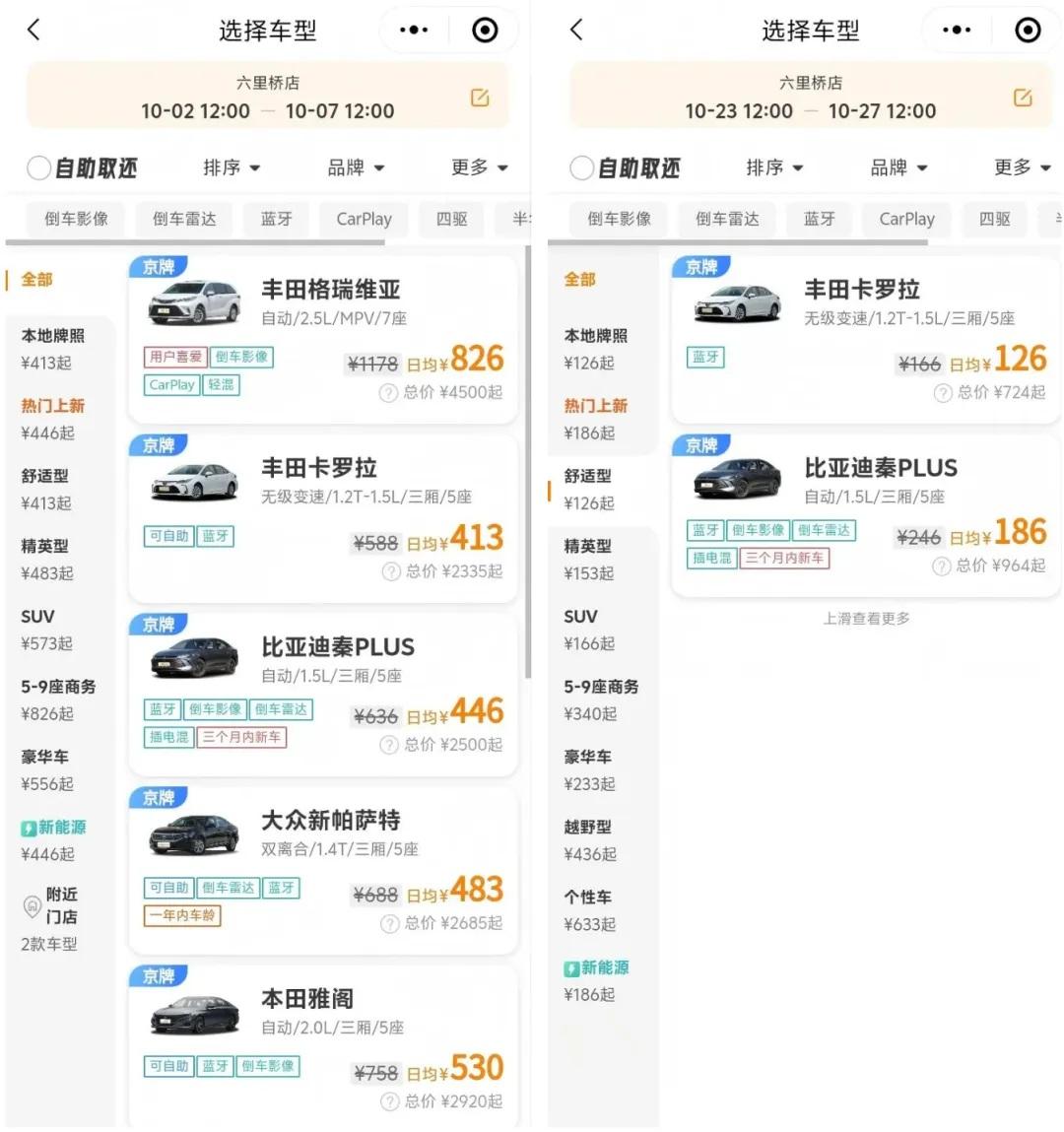 ▲某租車平臺(tái)國(guó)慶期間和節(jié)后租車價(jià)格對(duì)比。