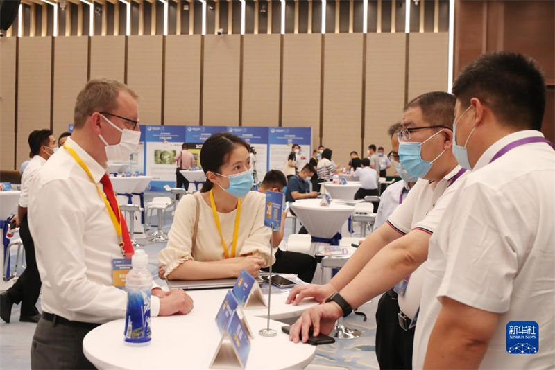 在第五屆中國(guó)國(guó)際進(jìn)口博覽會(huì)技術(shù)裝備展區(qū)展前供需對(duì)接會(huì)上,參展商代表(前左二)向采購(gòu)商介紹企業(yè)產(chǎn)品情況(2022年8月8日攝)。新華社記者 方喆 攝
