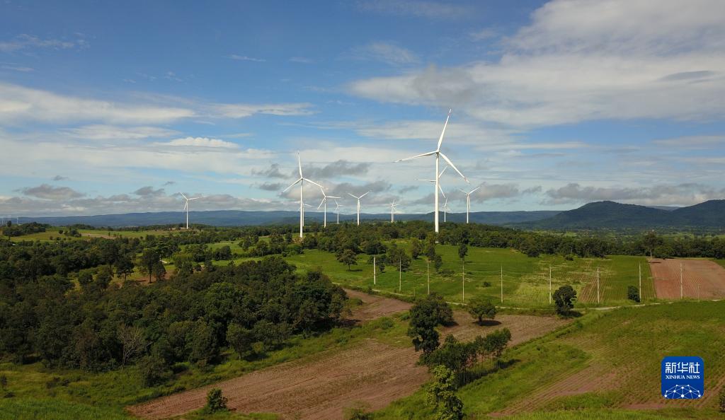 這是位于泰國猜也蓬府的由中國金風科技提供的風力發(fā)電機(2022年10月4日攝,無人機照片)。新華社發(fā)(塔納攝)