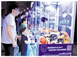 圖為在反詐互動(dòng)區(qū),家長(zhǎng)帶著小朋友在“反詐抓娃娃機(jī)”前,嘗試抓取“反詐公仔”。