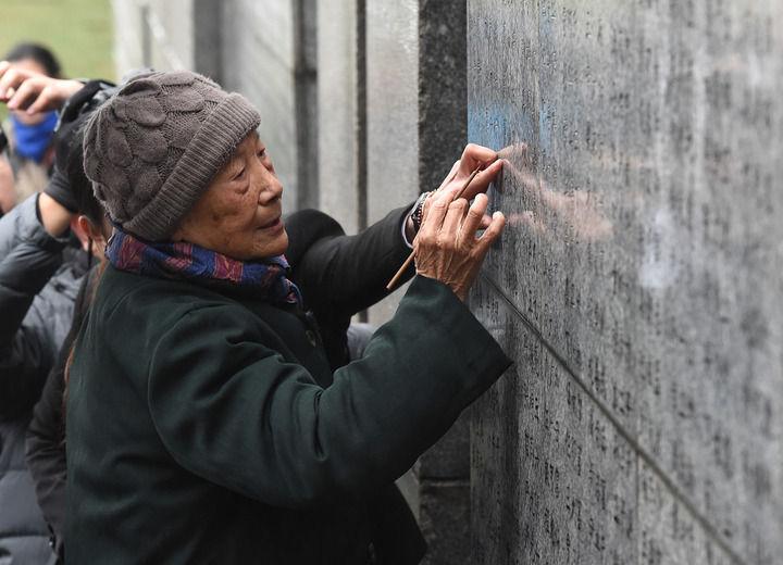 2018年12月10日,在侵華日軍南京大屠殺遇難同胞紀念館舉行的死難者遺屬家祭活動中,夏淑琴給遇難者名單墻上親人的名字添漆。新華社記者 孫參 攝