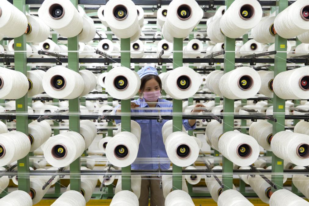 在中國平煤神馬集團簾子布發(fā)展公司布機車間,工作人員在檢查絲線生產(chǎn)情況。新華社記者 李嘉南 攝