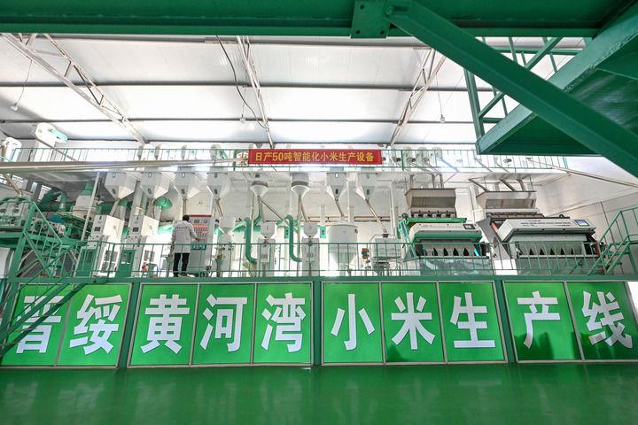 2025年7月1日拍攝的山西省呂梁市興縣晉綏黃河灣農業(yè)開發(fā)有限公司的小米生產線??箲?zhàn)時期,地處晉西北地區(qū)的興縣和靜樂縣是晉綏抗日根據(jù)地的一部分。新華社記者 李鑫 攝