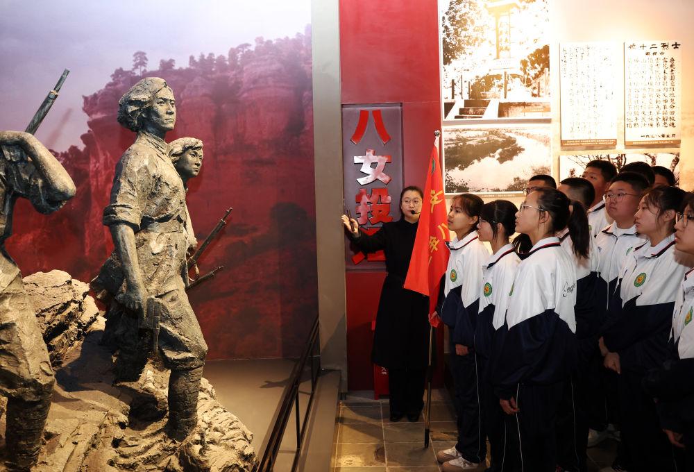 2025年4月3日,抗聯(lián)中學(xué)學(xué)生在東北抗聯(lián)史實陳列館聽講解員講述八女投江的故事。遼寧省本溪市本溪滿族自治縣抗聯(lián)中學(xué)與東北抗聯(lián)史實陳列館相距不足百米,每年都會開展東北抗聯(lián)精神教育活動,組織學(xué)生到陳列館,向抗聯(lián)英烈敬獻花籃,緬懷抗戰(zhàn)往事。近年來,為推動青少年更好地傳承紅色基因,遼寧積極推動抗聯(lián)精神融入大中小學(xué)思政課一體化建設(shè),編輯《中小學(xué)生抗聯(lián)史讀本》,圍繞“繼承抗聯(lián)傳統(tǒng)、學(xué)習(xí)抗聯(lián)精神”等主題舉辦表演、征文、競賽、夏令營和冬令營等活動。
