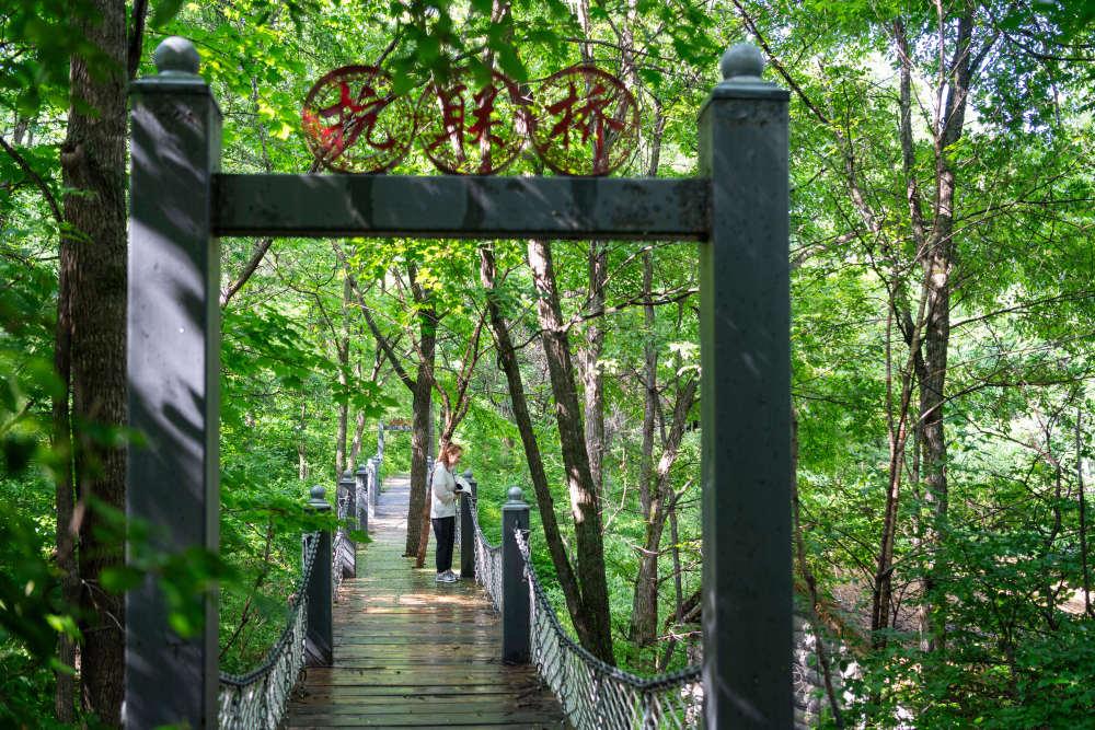 在黑龍江集賢縣、樺南縣、雙鴨山市嶺東區(qū)交界處的七星山間,分布著一系列東北抗聯(lián)密營遺址??箲?zhàn)時期,東北抗聯(lián)在此建立起兵工廠、被服廠、軍政干校、后方醫(yī)院、秘密營地、修械所等抗日基地,為抗日斗爭提供保障。近年來,當(dāng)?shù)丶哟髮ζ咝巧絿疑止珗@的建設(shè)投入,發(fā)揮其紅色教育、科普研學(xué)的愛國主義教育功能。這是2025年6月17日,游客在七星山國家森林公園參觀。