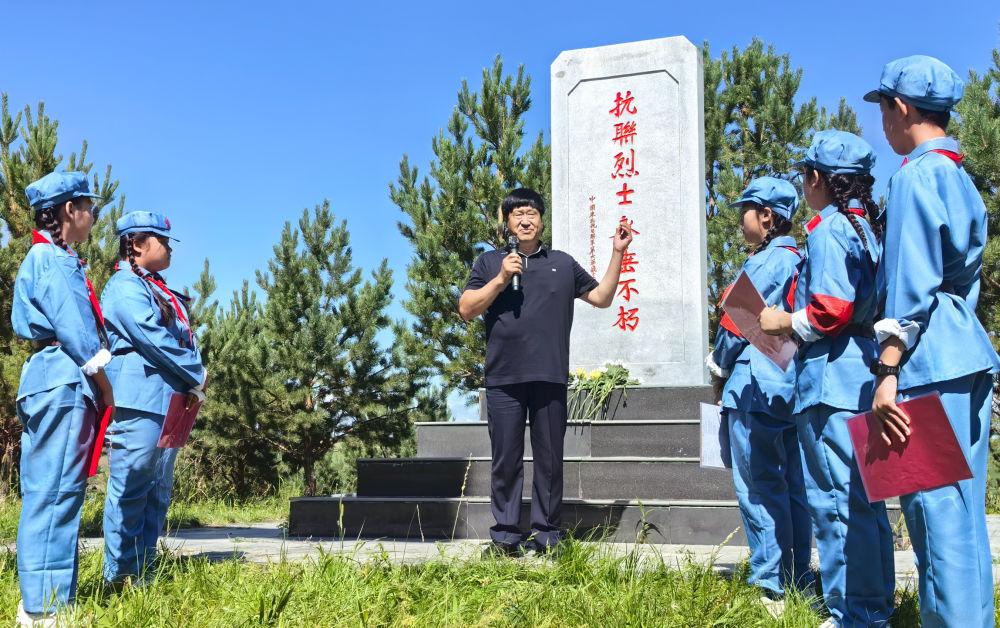 2025年8月14日,參加“重走抗聯(lián)路”活動的學(xué)生在內(nèi)蒙古呼倫貝爾市阿榮旗六合鎮(zhèn)“紅軍崗”聆聽東北抗聯(lián)事跡介紹。1940年,東北抗聯(lián)第三路軍在此與日偽軍激戰(zhàn),多名戰(zhàn)士為保護村民壯烈犧牲。當(dāng)?shù)厝罕娒半U將5位烈士遺體安葬于此,并立碑紀(jì)念。