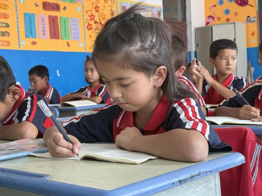 9月17日,鄯善縣達(dá)朗坎鄉(xiāng)中心學(xué)校三年級四班學(xué)生乃則熱與同學(xué)們上數(shù)學(xué)課。(受訪者供圖)