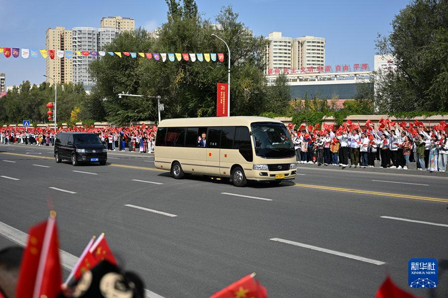 9月23日下午,中共中央總書(shū)記、國(guó)家主席、中央軍委主席習(xí)近平率中央代表團(tuán)乘專機(jī)抵達(dá)烏魯木齊,出席新疆維吾爾自治區(qū)成立70周年慶祝活動(dòng)。這是從機(jī)場(chǎng)到住地途中,習(xí)近平向沿途歡迎的群眾揮手致意。新華社記者 辛悅衛(wèi) 攝
