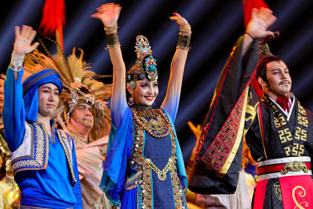 2022年4月22日,在新疆藝術(shù)劇院木卡姆藝術(shù)團劇場,舞蹈演員馬依熱·艾買提江(中)在舞劇《張騫》演出后向觀眾致謝。馬依熱來自烏魯木齊,11歲時前往北京跟隨專業(yè)舞蹈老師學(xué)習,學(xué)成后回到家鄉(xiāng),成為新疆藝術(shù)劇院歌舞團的一名舞蹈演員?!靶陆母栉枋侵腥A傳統(tǒng)文化的一部分,是用來歌頌美好生活的。希望我的舞蹈,能增進各民族間的感情,促進文化交融?!瘪R依熱說。