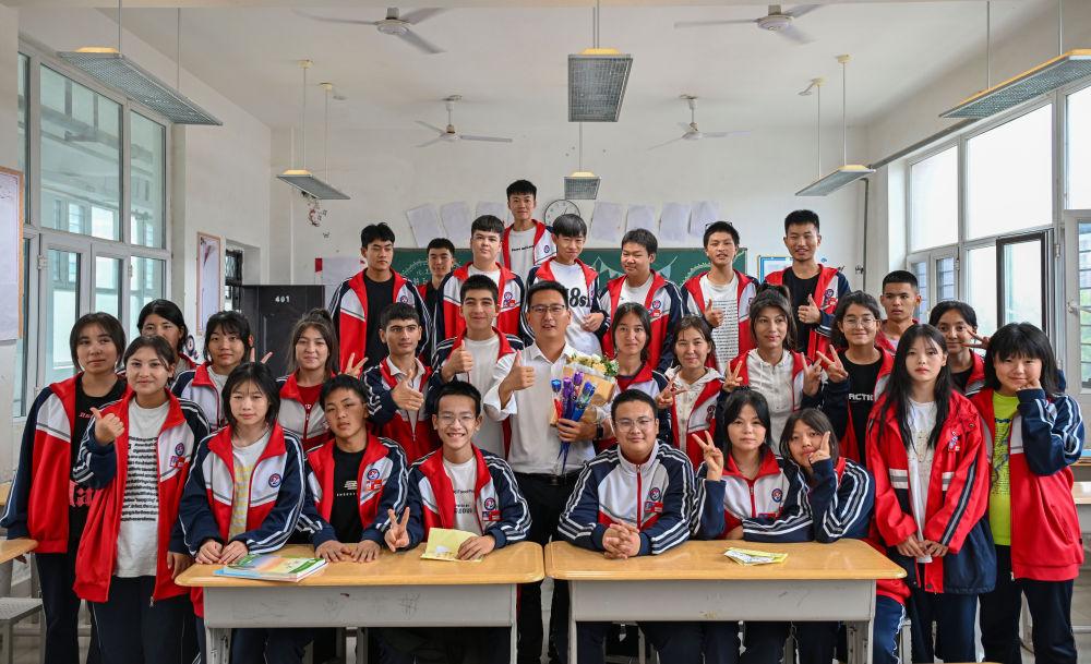 2024年9月10日,在新疆阿拉爾職業(yè)技術(shù)學(xué)校,援疆教師李斌傲(中)和23級電商班的學(xué)生合影?!?5后”年輕教師李斌傲是第十一批浙江臺州到新疆阿拉爾職業(yè)技術(shù)學(xué)校援疆教師中的一員,負責教授電子商務(wù)專業(yè)課程。他在學(xué)校主導(dǎo)籌建了電商實訓(xùn)室,還帶了4個新入職的教師當徒弟。“培訓(xùn)好本地教師,就是打造一支帶不走的隊伍?!崩畋蟀琳f。