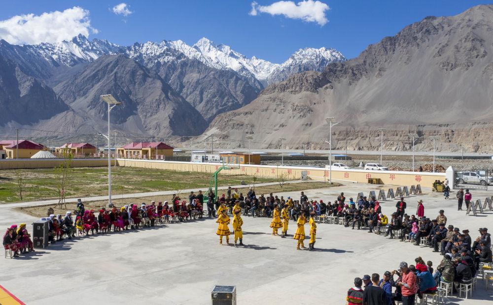 2020年6月6日,新疆塔什庫爾干塔吉克自治縣文工團演員在達布達爾鄉(xiāng)的一個山村為村民表演舞蹈節(jié)目(無人機照片)。塔縣文工團成立于1956年,現(xiàn)有工作人員100余人,是活躍于新疆帕米爾高原上的“文藝輕騎兵”。在自然環(huán)境嚴酷的高原,塔縣文工團演員們常年堅持送文化進山村、到牧場,宣講惠民政策,用文藝演出豐富村民的精神文化生活。