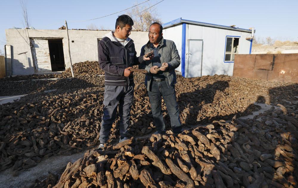 2024年12月4日,新疆民豐縣尼雅鎮(zhèn)甫甫克村村民麥麥提(右)同前來收購大蕓的商戶交流。自20世紀末新疆全面開展防風治沙工程并大力推進沙產(chǎn)業(yè)以來,麥麥提從在合作社挖大蕓賺工錢,到后來主動學(xué)習大蕓種植技術(shù)并創(chuàng)業(yè),一路走來小有收獲。2018年,他承包了10畝沙地種紅柳、大蕓。紅柳茁壯成長,大蕓產(chǎn)量頗豐,麥麥提年收入超過5萬元。