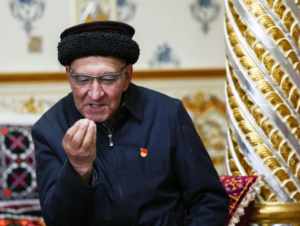 2023年9月4日,“時代楷模”拉齊尼·巴依卡的父親巴依卡老人在新疆塔什庫爾干塔吉克自治縣的家中接受采訪。生活于帕米爾高原上的塔吉克族兒女,素來心中懷有“家是塔縣,國是中國,放牧守邊是職責”的愛國守邊精神。巴依卡老人一家三代70年接續(xù)守邊護邊,愛國奉獻的壯舉感動了無數(shù)國人?!斑吘尘€是中國的邊境線,紅其拉甫是中國56個民族的紅其拉甫,我們的56個民族就要像石榴籽一樣緊緊抱在一起?!卑鸵揽ɡ先苏f。