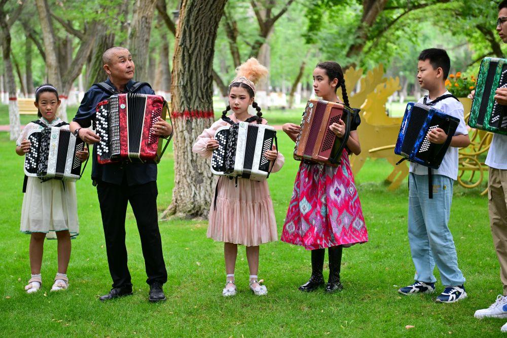2024年7月24日,在新疆塔城市文化廣場,手風琴文化傳承中心老師道吾然·對山漢(左二)帶領(lǐng)學(xué)生練習手風琴。塔城市居住著漢族、哈薩克族、回族、維吾爾族、蒙古族、塔塔爾族、俄羅斯族等20多個民族,是一片多元文化沃土。手風琴是塔城市民間最廣為流傳的樂器,也是各族人民文化交流的重要媒介。近年來,塔城市深入挖掘手風琴文化,舉辦多場手風琴文化藝術(shù)節(jié)活動,為各民族文化交流提供平臺。