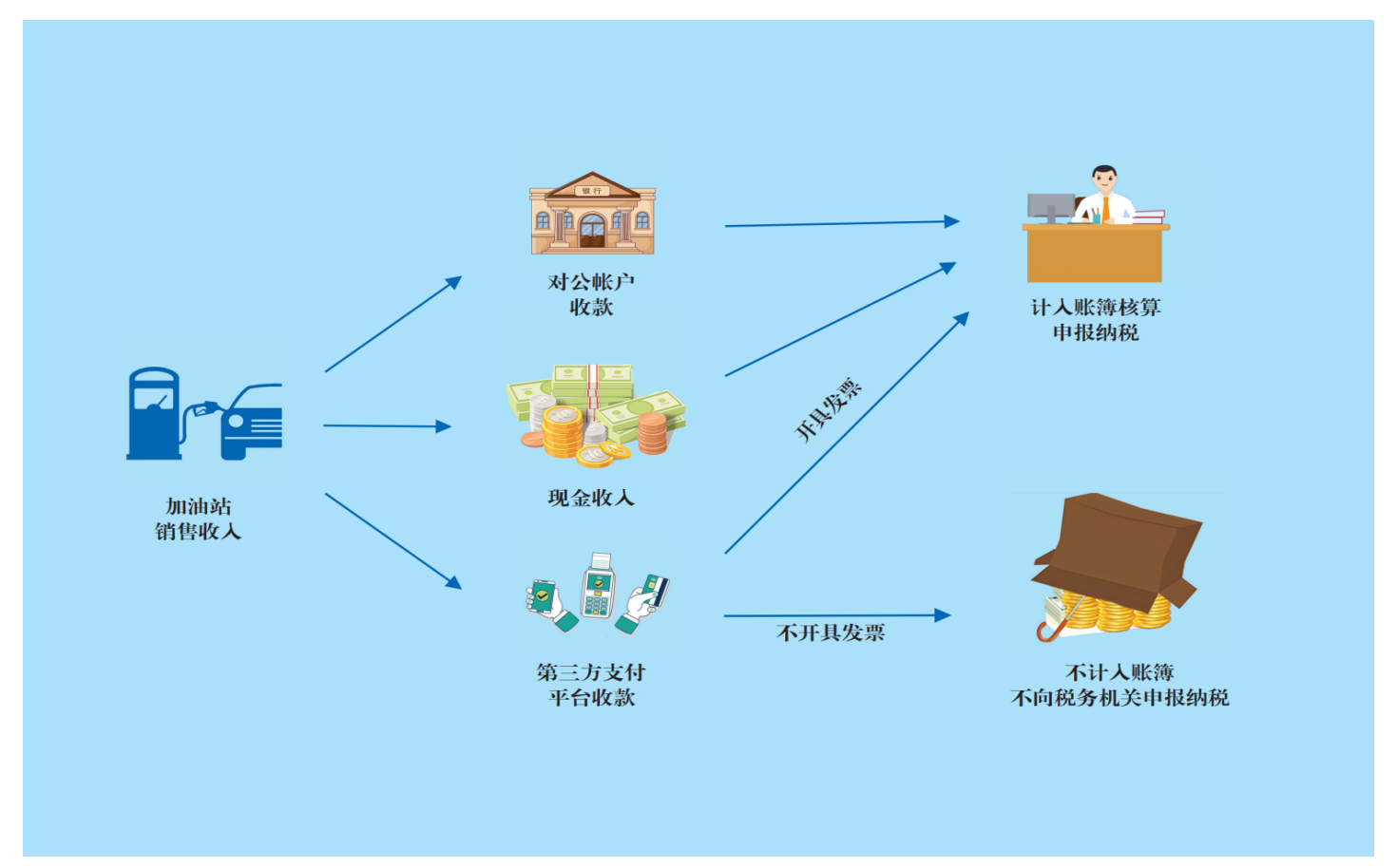 在進一步核查中,檢查人員發(fā)現(xiàn),該加油站通過移動支付方式收取的加油款既沒有在賬簿中記載,也沒有在其對公賬戶的流水中發(fā)現(xiàn)相關(guān)記錄,更沒有找到其向稅務(wù)機關(guān)申報納稅的痕跡。