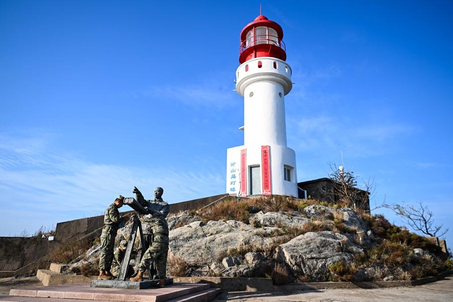 開山島守島民兵保養(yǎng)清潔王繼才雕像(2024年10月25日攝)。新華社記者 鄧華 攝