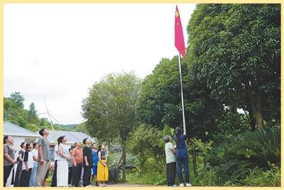 拿著鋤頭出工的鄉(xiāng)親,晨起的學(xué)生,專程過來的男女老少……30多名村民圍在旗桿邊,自覺立正、唱國歌、行注目禮,用堅定的眼神注視著飄揚的紅旗。山風(fēng)與鳥鳴,為齊唱的國歌聲伴奏。