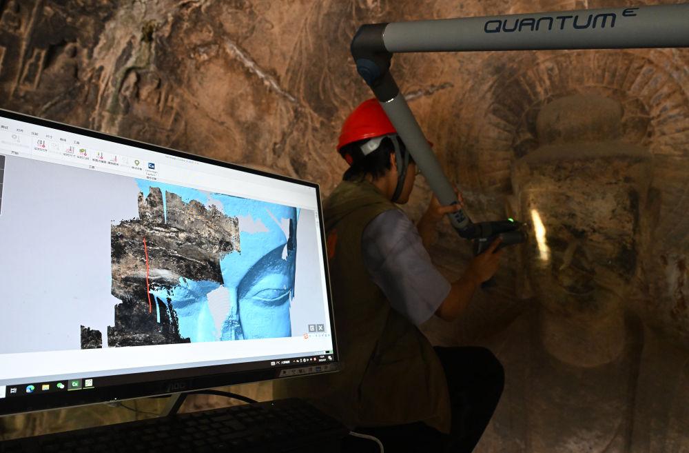 2025年4月9日,武漢大學文化遺產(chǎn)智能計算實驗室團隊成員在河南洛陽龍門石窟魏字洞使用關節(jié)臂掃描儀對佛像進行數(shù)字化掃描。從2005年起,龍門石窟研究院開始為龍門石窟建立數(shù)字化檔案,借助激光掃描、高清攝影等技術手段收集文物數(shù)據(jù),以數(shù)字的形式留存千年石刻群的風貌,致力于讓這一規(guī)模宏大、氣勢磅礴的石窟瑰寶“芳華永駐”。