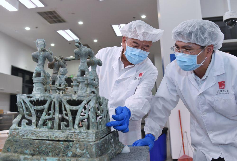 2023年5月30日,在四川三星堆博物館文物保護和修復中心,文物修復師郭漢中(左)與同事討論神壇底座修復方案。郭漢中從事文物修復工作已40余年,深度參與了三星堆祭祀坑的發(fā)掘工作,累計修復文物6000余件?!按蟾胚€有上萬件文物等著修復,需要一代接著一代往下干?!惫鶟h中說,他要把平生所學傳承下去,培養(yǎng)更多人才。