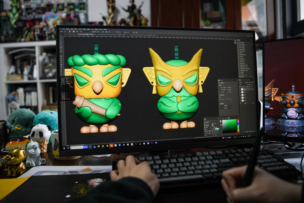 2025年3月1日,文創(chuàng)產(chǎn)品策劃運營師曾舟在位于四川成都的辦公室內完善文創(chuàng)產(chǎn)品細節(jié)。他以三星堆青銅神樹、青銅縱目面具、青銅獸面等文物為創(chuàng)作藍本,結合潮玩元素設計的文創(chuàng)作品廣受歡迎。“我想做的不是玩具快消品,而是有內容、有溫度、有意義的文化IP,讓年輕一代隨手摸到沉淀千年的文化。”曾舟說。