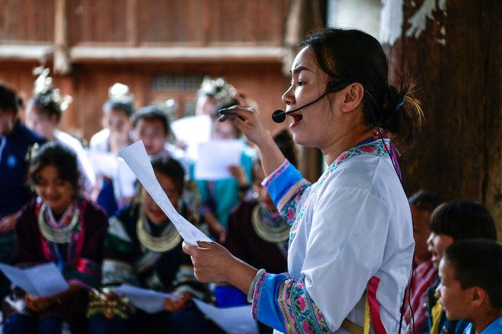 隨著國產(chǎn)動畫電影《哪吒之魔童鬧海》不斷刷新中國影史票房紀(jì)錄,參與電影配樂的貴州省榕江縣三寶侗寨的楊想妮和“舞樂蟬歌”團隊為更多人所熟知。樂團成員懷揣“用音樂傳遞侗族文化,讓世界聽見侗族大歌”的共同夢想,將侗族大歌推向更廣闊的舞臺。這是2025年4月22日,楊想妮在貴州省黎平縣肇興鎮(zhèn)廈格侗寨教前來研學(xué)的孩子們唱侗歌。