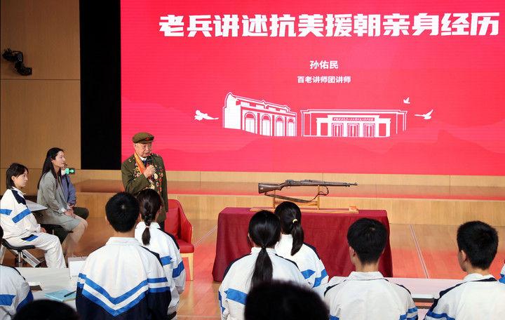 2021年10月25日,老兵代表在上海中學(xué)的課堂上講述抗美援朝的親身經(jīng)歷。這堂特別的思政課是中共一大紀(jì)念館“百物進百校,百講證百年”活動的第一講,紀(jì)念館從館藏中精選100件革命文物,帶進學(xué)校課堂,以“文物進校園”的形式,用好用活紅色資源,賡續(xù)紅色血脈。