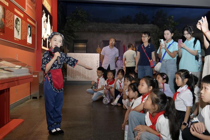 2025年8月7日,在山東省臨沂市沂蒙革命紀(jì)念館,沂蒙紅孩子文藝先鋒隊的房沫昕在講述紅色故事《沂蒙紅嫂祖秀蓮》。2024年9月,位于沂蒙革命老區(qū)的山東省臨沂市以“傳承沂蒙精神”為宗旨組建沂蒙紅孩子文藝先鋒隊,通過歌舞、朗誦、故事講述、舞臺劇等紅色主題文藝節(jié)目,增強紅色文化感染力,不斷為紅色基因代代相傳注入新生力量。