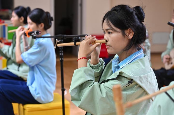 2025年6月12日,海南省民族技工學(xué)校學(xué)生在練習(xí)黎族鼻簫。近年來,海南省五指山市打造“非遺進校園”工程,在14所公辦中小學(xué)開設(shè)非遺課程,培養(yǎng)青少年對中華優(yōu)秀傳統(tǒng)文化的熱愛,助力非遺傳承與發(fā)展。