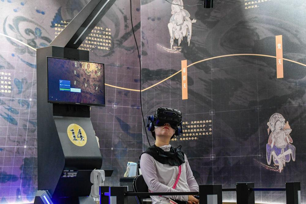 2024年7月22日,游客在“尋境敦煌——數(shù)字敦煌沉浸展”借助VR設(shè)備沉浸式游覽莫高窟第285窟虛擬場景?!皩ぞ扯鼗汀獢?shù)字敦煌沉浸展”綜合運用VR虛擬現(xiàn)實、三維建模、游戲引擎的物理渲染和全局動態(tài)光照等新技術(shù),高精度立體還原了莫高窟第285窟。游客戴上VR眼鏡,不僅可以零距離觀賞壁畫、360度自由探索洞窟細節(jié),還能“飛升”到窟頂,身臨其境參與壁畫故事情節(jié),沉浸式感受敦煌文化的魅力。