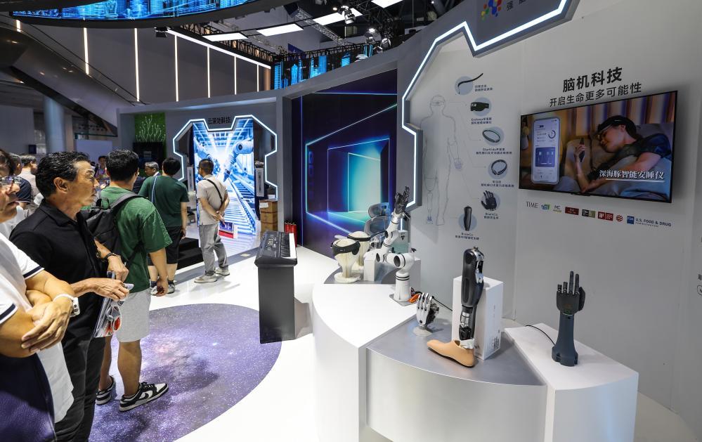 9月25日,在第四屆全球數(shù)字貿(mào)易博覽會(huì)數(shù)智未來(lái)主題展區(qū)的杭州六小龍專(zhuān)區(qū),觀(guān)眾在觀(guān)看強(qiáng)腦科技的智能仿生手。新華社記者 徐昱 攝