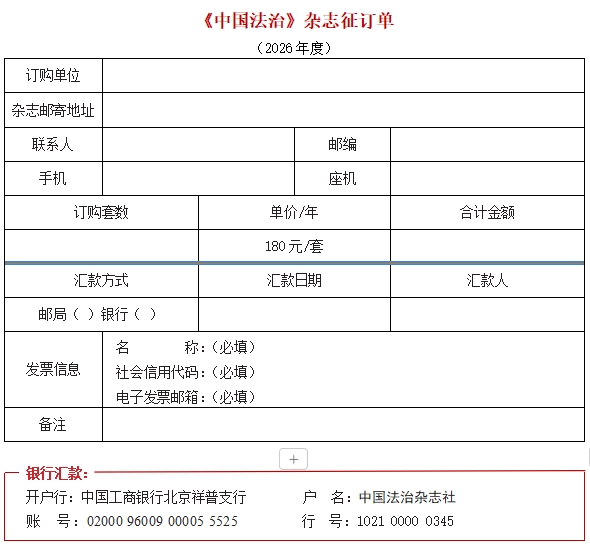 ★匯款時(shí)請(qǐng)務(wù)必標(biāo)明“中國(guó)法治+訂購(gòu)套數(shù)”,個(gè)人匯款另需注明“單位名稱(chēng)”。