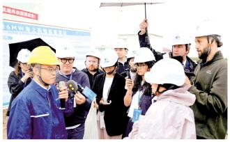 圖為9月19日,中外媒體記者在位于山東東營(yíng)的26兆瓦級(jí)海上風(fēng)力發(fā)電機(jī)組項(xiàng)目現(xiàn)場(chǎng)采訪。 新華社發(fā)