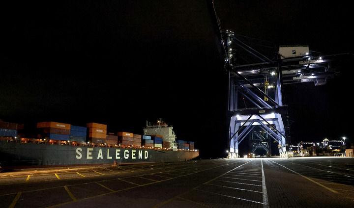 2025年10月13日,在英國費利克斯托港,中歐北極快航航線首艘貨船駛入碼頭。新華社記者 李穎 攝