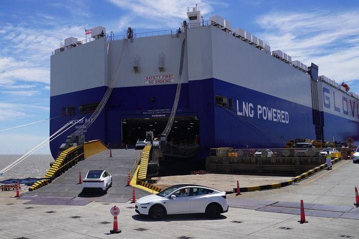 2025年7月2日,在上海自貿試驗區(qū)臨港新片區(qū)南港碼頭,一批新能源汽車駛向一艘滾裝貨輪。新華社記者 楊有宗 攝