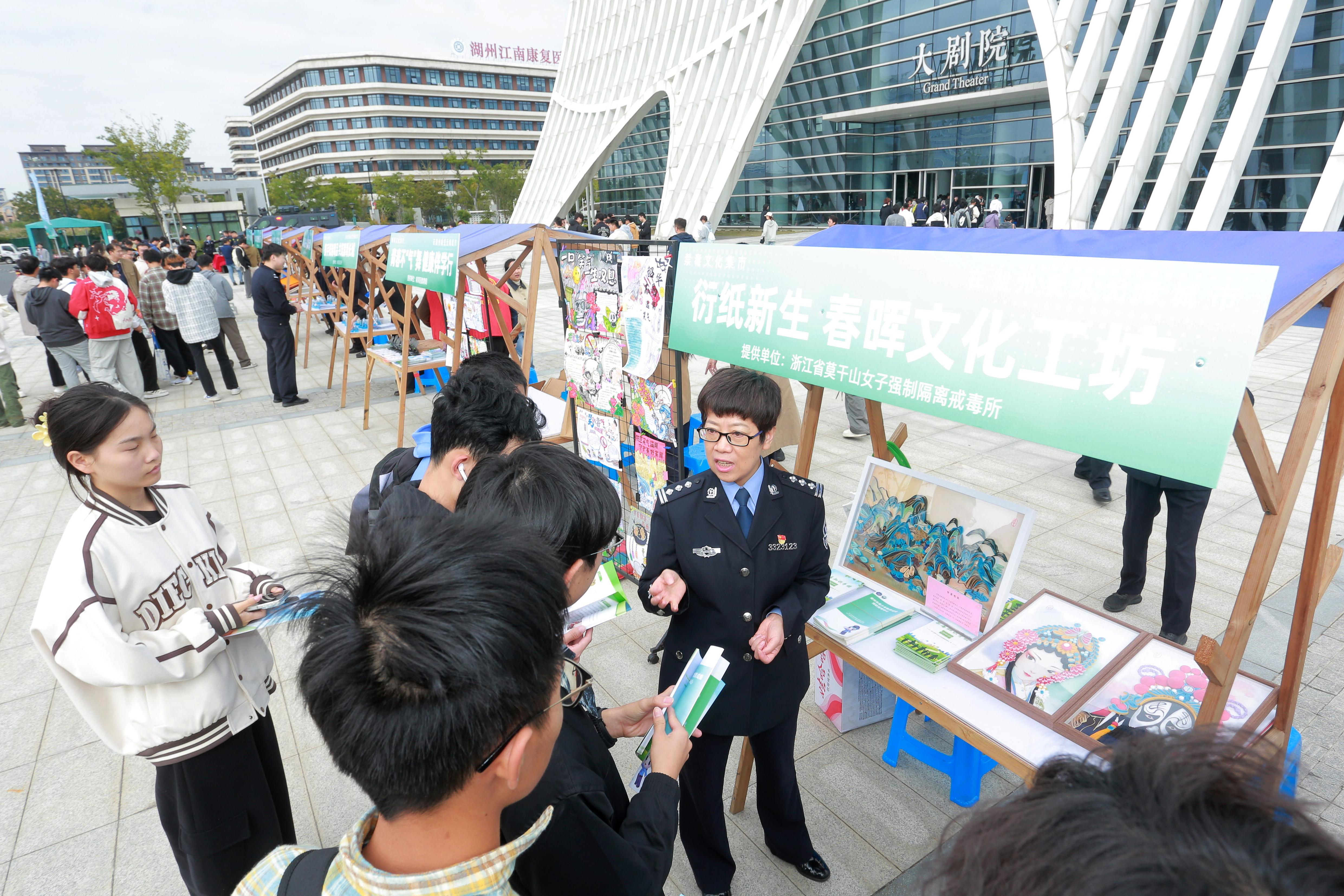 當(dāng)天,浙江水利水電學(xué)院大劇院前廣場的禁毒市集率先“開市”,巨型魔方禁毒logo醒目亮眼,創(chuàng)客大賽獲獎(jiǎng)作品集中展出;市公安局特警支隊(duì)的緝毒犬現(xiàn)場表演“識(shí)毒絕技”,靈敏嗅覺引得師生陣陣驚嘆;“機(jī)器狗尋毒”演示展現(xiàn)科技禁毒新力量,南潯公安分局特警裝備與防暴車展示更讓師生直觀感受禁毒執(zhí)法硬實(shí)力。此外,湖州市南潯區(qū)公安分局、檢察院、法院、教育局、司法局等十余個(gè)禁毒職能部門設(shè)攤宣傳,通過“笑氣”模型展示、知識(shí)折頁發(fā)放、互動(dòng)答疑等形式,將“笑氣”危害與防范知識(shí)傳遞給每一位參與者。