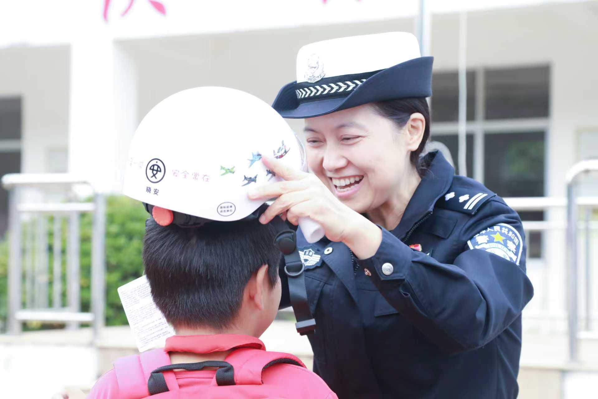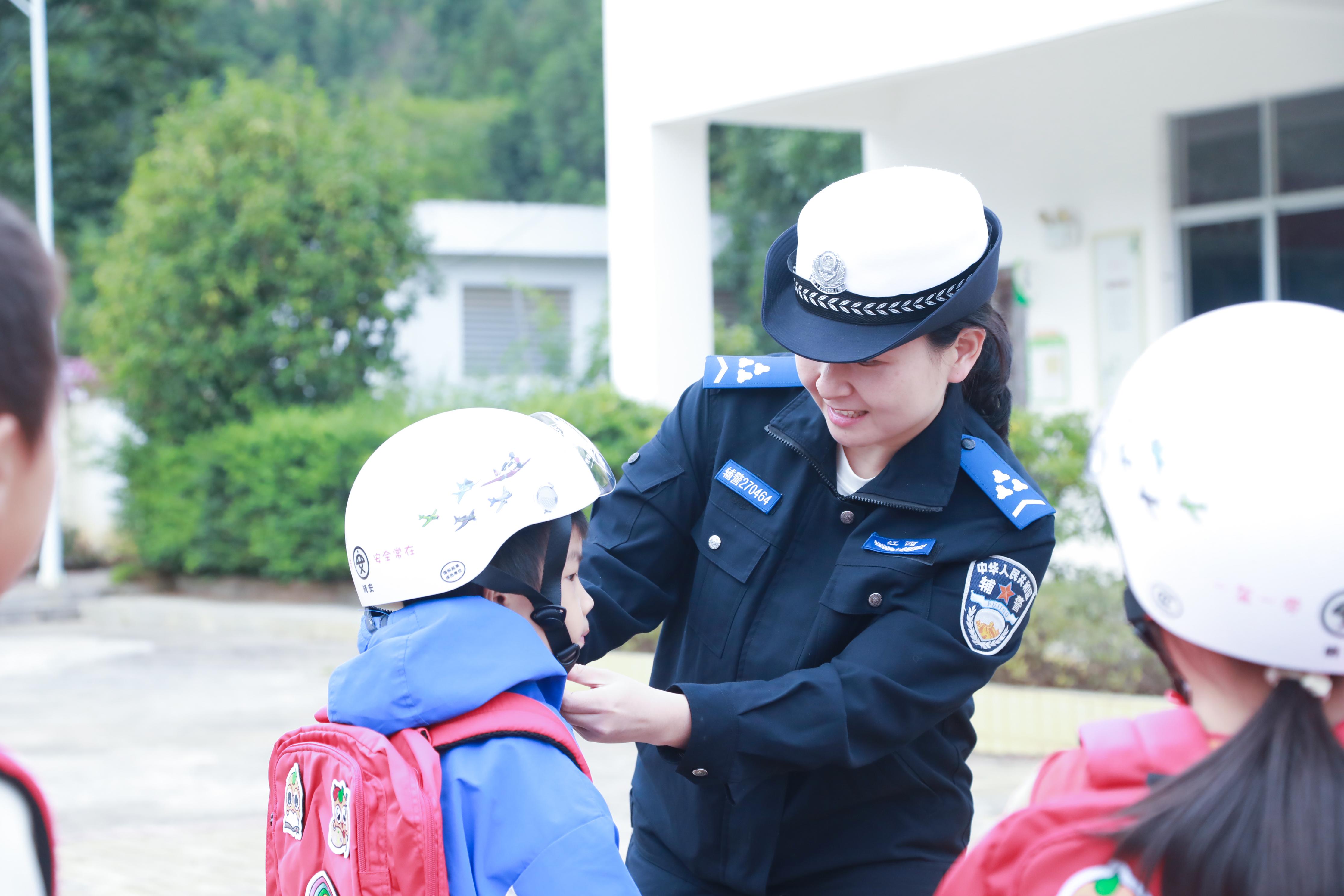 圖為10月24日,民警在章貢區(qū)水西鎮(zhèn)凌源小學(xué)為學(xué)生贈送書包和安全頭盔。