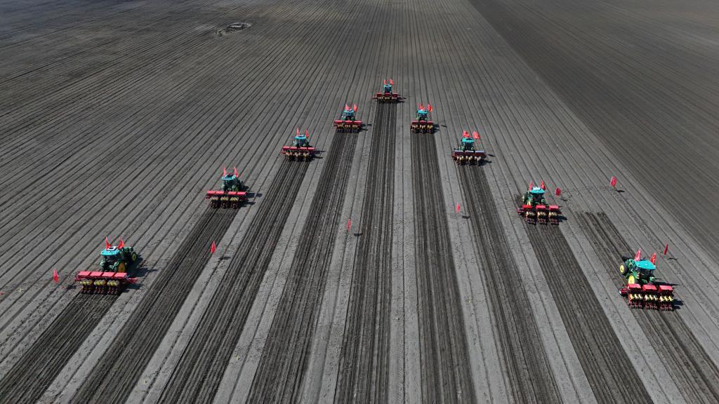 2025年5月8日,在黑龍江雙鴨山一旱田地塊,大馬力農業(yè)機械準備在黑土地上進行大豆播種作業(yè)(無人機照片)。新華社記者 王松 攝